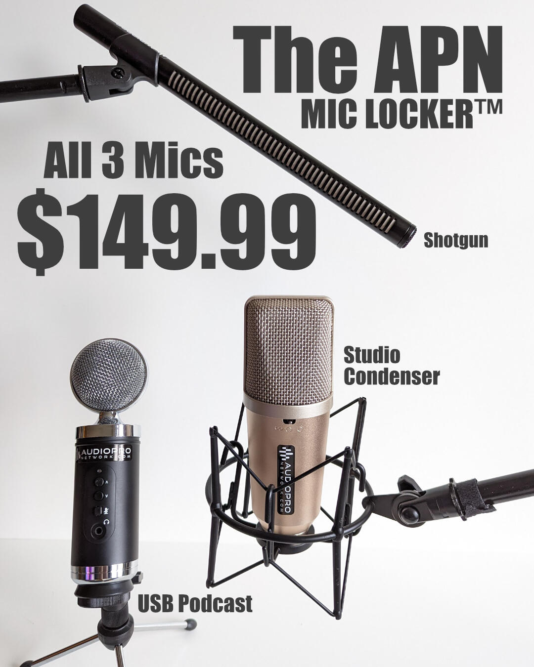 Buy the microphones on their own! Start of your very own mic locker with our custom Audio Pro Network™ Microphones! Get a large diaphragm studio condenser, shotgun and USB mic, all with hard cases.